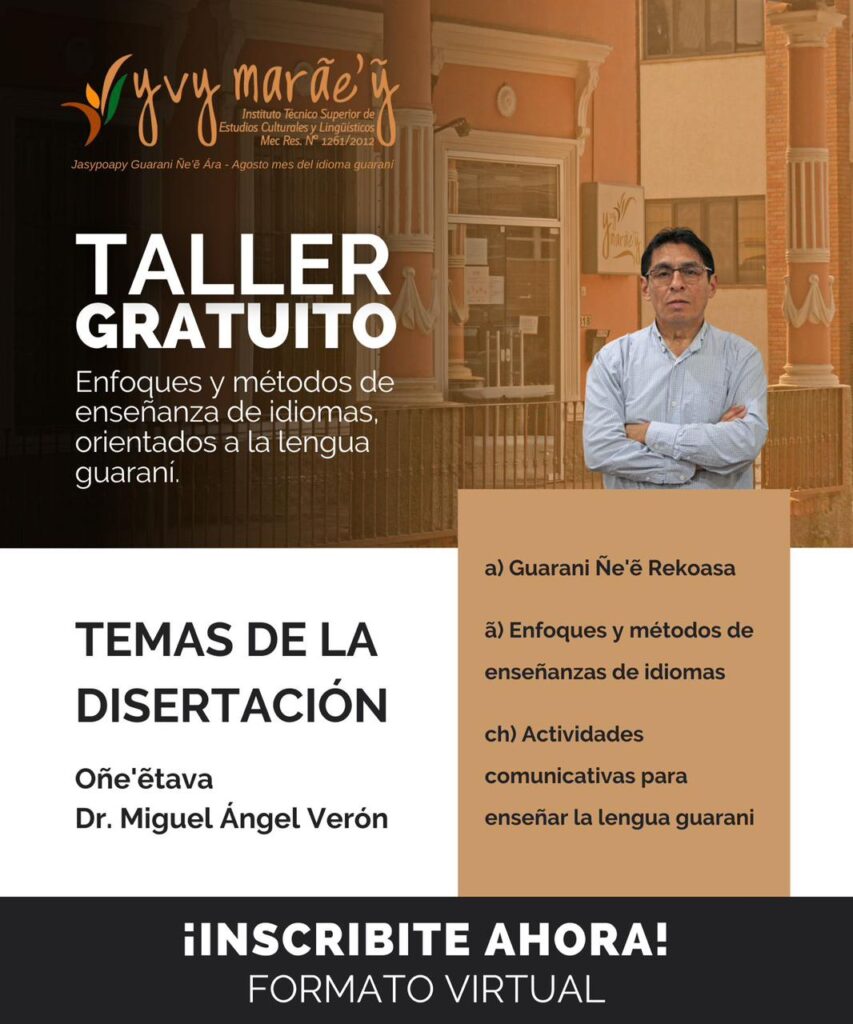 Mañana sábado 26 de agosto arrancará el Taller gratuito sobre Enfoques y métodos de enseñanza de idiomas, orientados a la lengua guaraní, que se extenderá hasta el sábado 2 de setiembre, organizado por el Instituto Técnico Superior de Estudios Culturales y Lingüísticos Yvy Marãe’ỹ. Este taller se realiza en el marco de la celebración de la Semana de la Lengua Guaraní, y está dirigido a docentes de esta lengua oficial y propia del Paraguay.