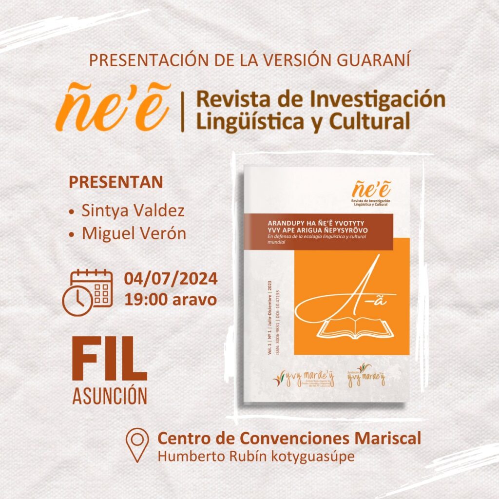 Este jueves, 4 de julio de 2024, será presentada Ñeʼẽ. Revista de Investigación Lingüística y Cultural, versión guaraní, publicada por la Fundación Yvy Marãe’ỹ y el Instituto Técnico Superior de Estudios Culturales y Lingüísticos Yvy Marãe’ỹ. El evento se realizará en el marco de la Feria Internacional del Libro 2024, en el Auditorio Humberto Rubín del Centro de Convenciones Mariscal, a las 19:00 horas, en la mesa de la Academia de la Lengua Guaraní (ALG), junto a académicos de este cuerpo de colegiado. La presentación estará a cargo de su director, el académico Miguel Ángel Verón, y de la editora general, la socióloga Sintya Valdez. En la misma mesa, presentarán sus obras el presidente de la ALG, el académico Mauro Lugo, y los académicos Mario Rubén Álvarez, Indalecio Riquelme y Carlos Ferreira.
